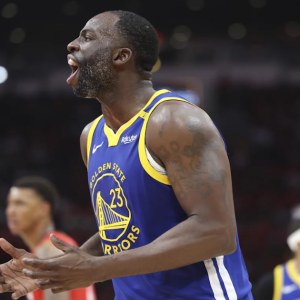 Apr 20, 2025; Houston, Texas, USA; Golden State Warriors forward Draymond Green (23) reacts after a call during the fourth quarter against the Houston Rockets at Toyota Center. Mandatory Credit:…