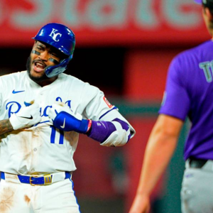 Kansas City Royals third baseman Maikel Garcia (11) celebrates after hitting a double during the ninth inning against the Colorado Rockies at Kauffman Stadium on April 22, 2025. Jay Biggerstaff…