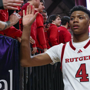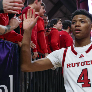 Mar 9, 2025; Piscataway, New Jersey, USA; Rutgers Scarlet Knights guard Ace Bailey (4) slap hands with fans after the game against the Minnesota Golden Gophers at Jersey Mike’s Arena….