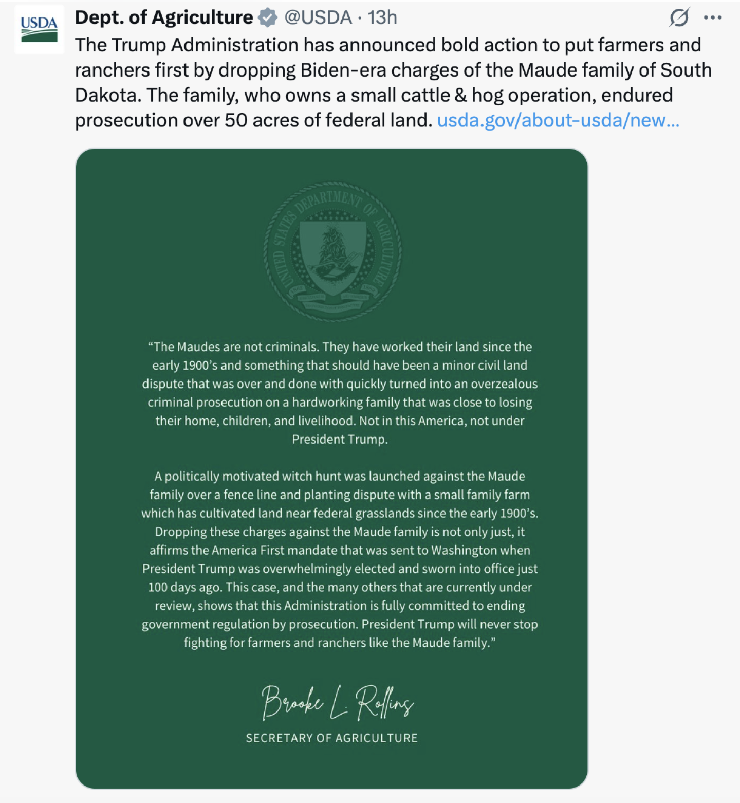 “The Maudes are not criminals. They have worked their land since the early 1900s and something that should have been a minor civil land dispute that was over and done with quickly turned into an overzealous criminal prosecution on a hardworking family that was close to losing their home, children and livelihood. Not in this America, not under President Trump,” said Secretary of Agriculture Brooke Rollins in a statement released by USDA.