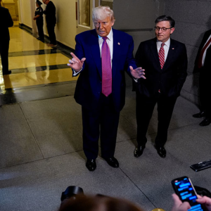 U.S. President Donald Trump, accompanied by Speaker of the House Mike Johnson, speaking to the media as he departs a House Republican meeting at the U.S. Capitol on May 20,…