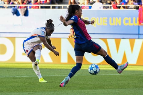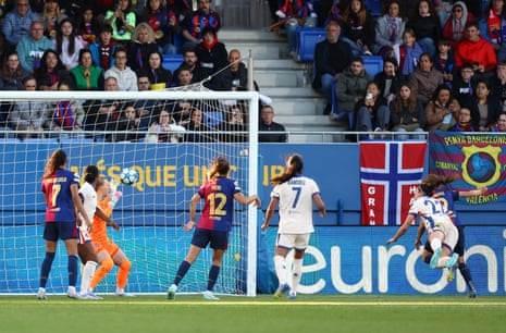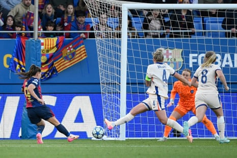 Barcelona’s Irene Paredes scores their third goal. Photograph: Albert Gea/Reuters