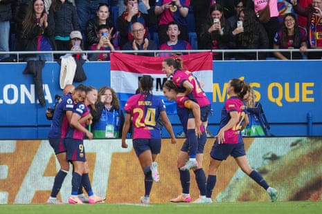 Claudia Pina of Barcelona celebrates scoring her team’s second goal. Photograph: Álex Caparrós/UEFA/Getty Images