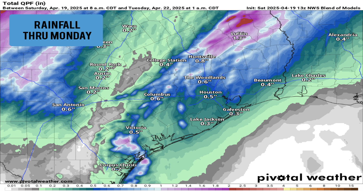 Rain totals are expected to stay relatively low. Models indicate that the Houston metro area will see close to a half-inch of rain through Monday. Totals will be higher as you move north, with between 0.75 and 1.5 inches likely from Huntsville to Lufkin.