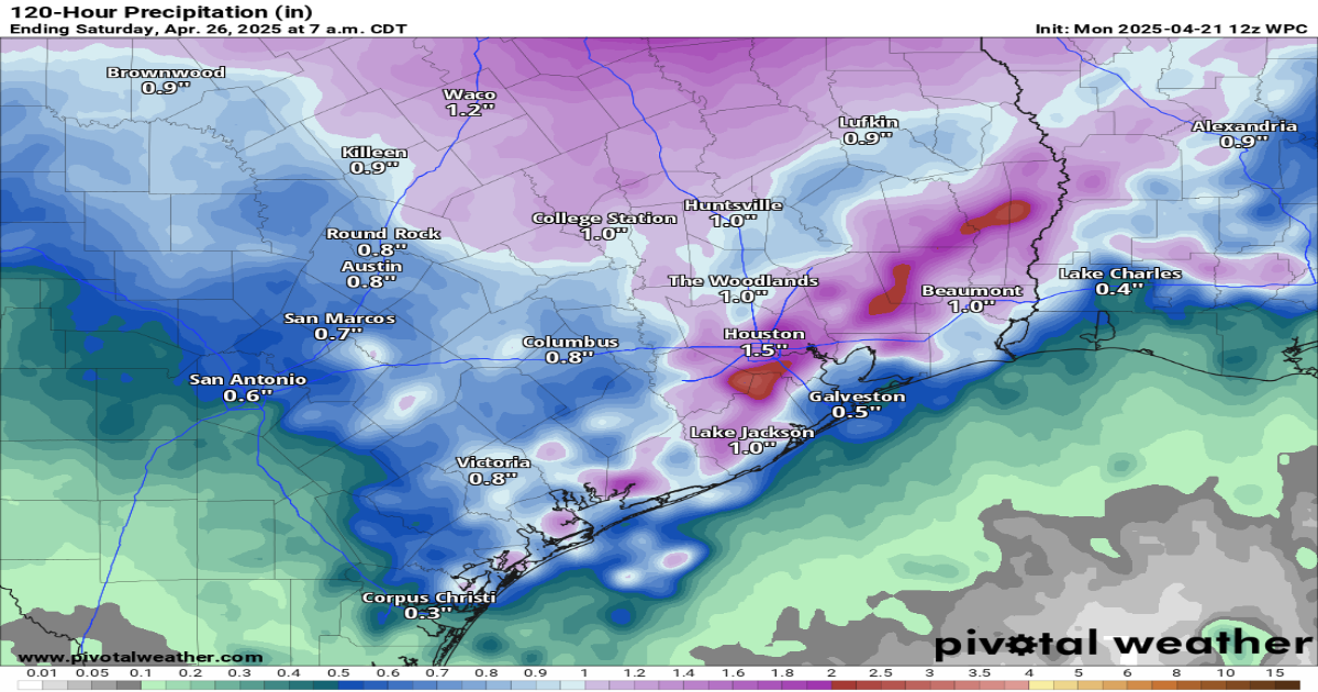 Rain chances Thursday and Friday fall back to around 40%, with favored rainy spots expected north of Interstate 10. Rainfall totals Thursday and Friday should remain below an inch in most areas, with spots that repeatedly get storms seeing more than an inch.