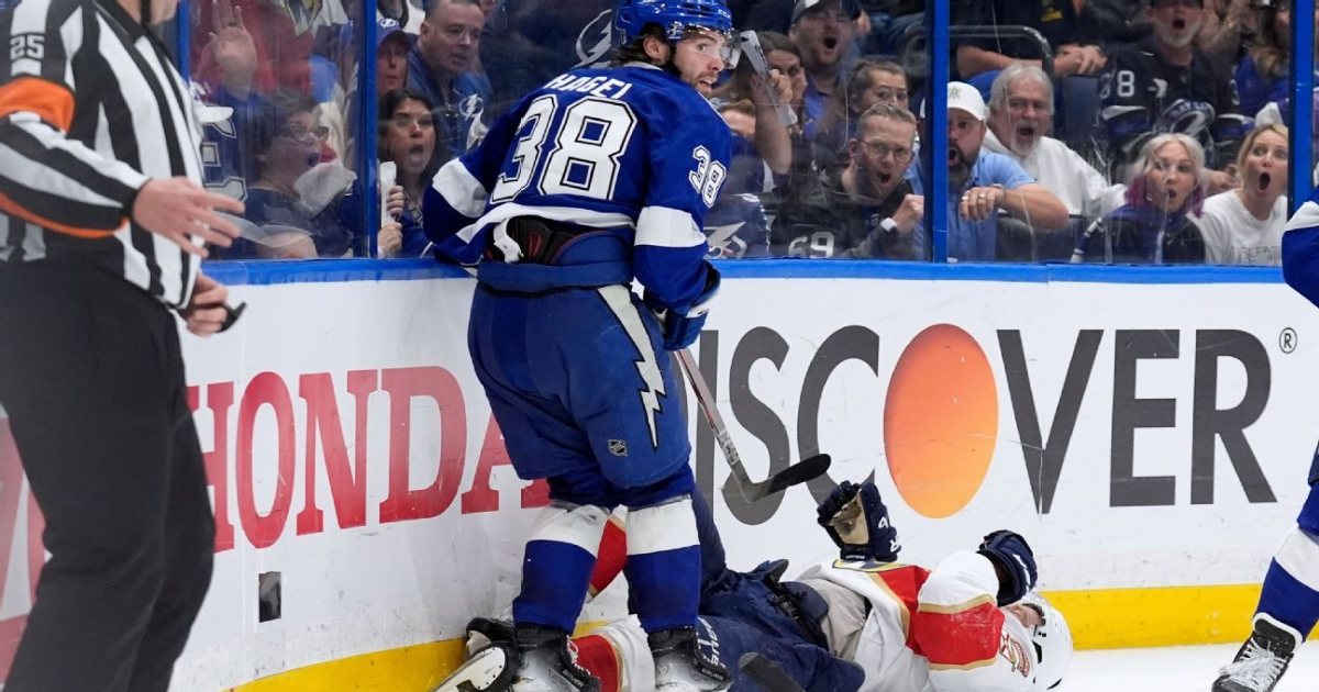 Around midway through the third period of Thursday’s Game 2, Tampa Bay was on the power play while trailing 1-0. Barkov pressured defenseman Ryan McDonagh deep in the Lightning zone. With the puck clearly past Barkov, Hagel lined him up for a huge hit that sent the Panthers captain to the ice and thumping off the end boards.