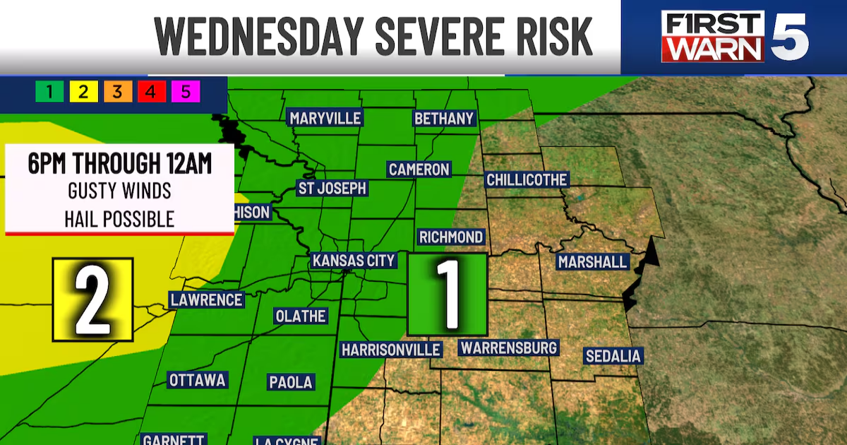 KANSAS CITY, Mo. (KCTV) – Typical spring like pop-up showers and weak thunderstorms are possible this afternoon. We do have a First Warn in place starting at 3 pm for the potential of strong to severe storms through the evening. The storms move in from the northwest and slowly drag southeast through the evening. Much of the storm activity is expected to stay around I-70 and north.