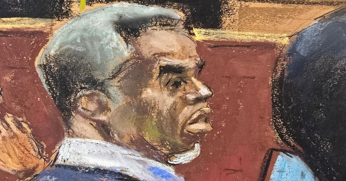 Combs watches as his former personal assistant David James is questioned by prosecutor Christy Slavik before Judge Arun Subramanian at his sex trafficking trial in New York City on Tuesday. (Jane Rosenberg/Reuters)