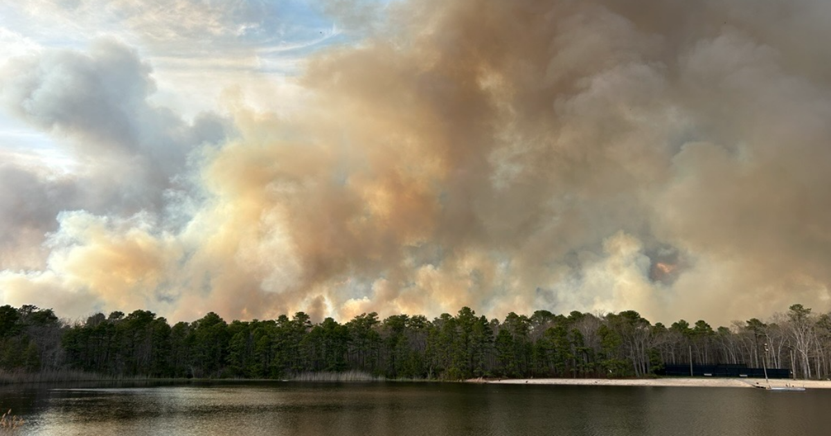 “We saw a lot of smoke and ash coming down, a lot of it,” said Tyler Gonella, who was walking his dog Tanner on the shoreline of Wells Mills Park in Waretown early on during the blaze.